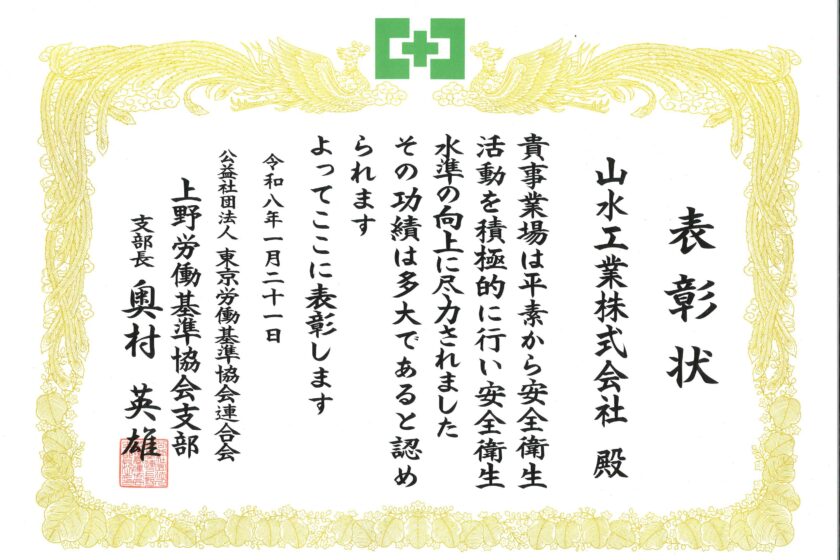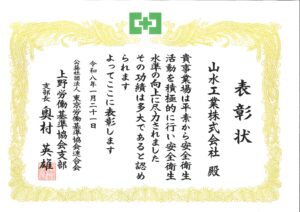 全社員一丸となり、長年安全管理の充実に努力してきた結果 上野労働基準協会支部にその功績が認められ、平成30年につづき二度目の 表彰状をいただきました。 忘年会(2025年度) 前の記事 インターンシップ 次の記事